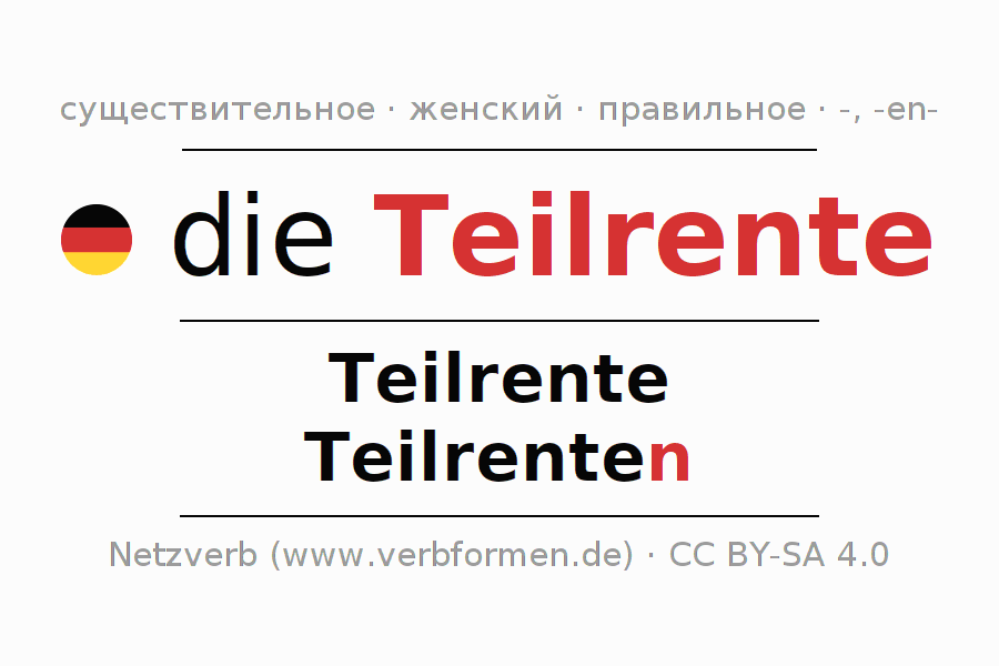 - Множественное число: die Teilrenten, der Teilrenten, den Teilrenten, die Teilrenten