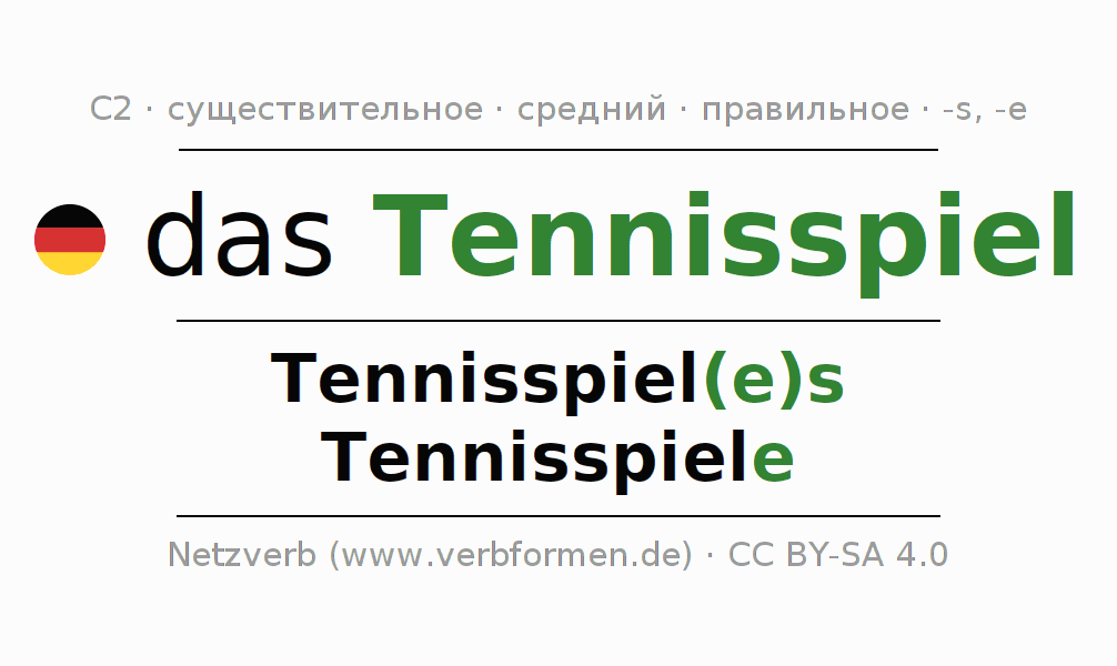 - Множественное число: die Tennisspiele, der Tennisspiele, den Tennisspielen, die Tennisspiele