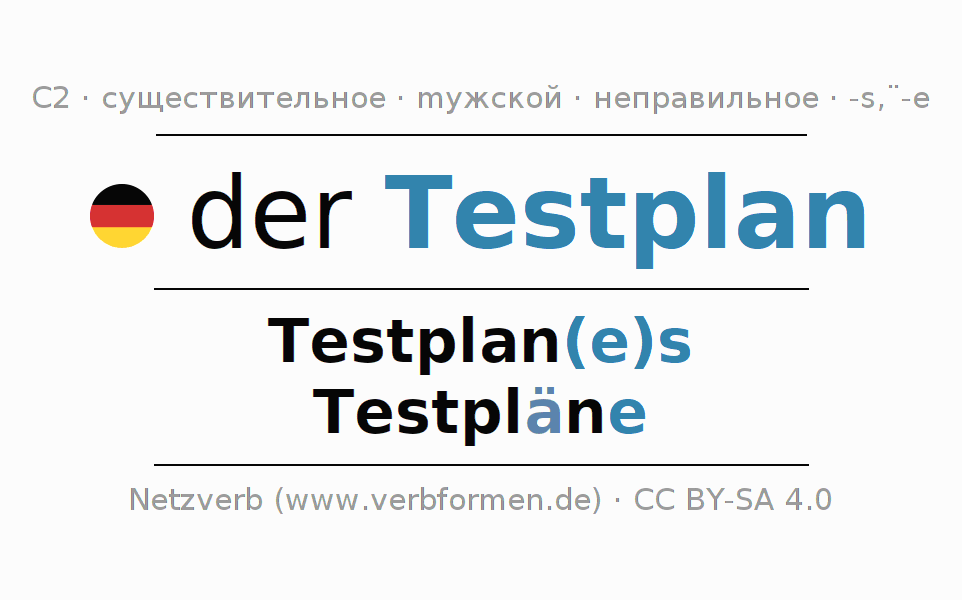 - Множественное число: die Testpläne, der Testpläne, den Testplänen, die Testpläne