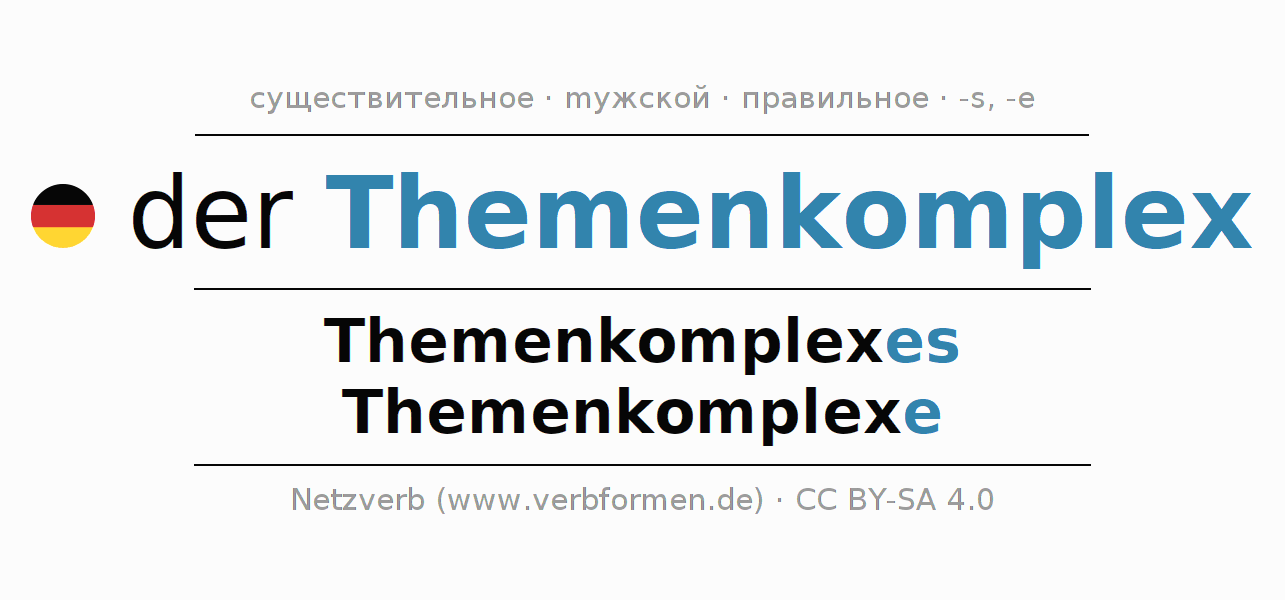 - Множественное число: die Themenkomplexe, der Themenkomplexe, den Themenkomplexen, die Themenkomplexe