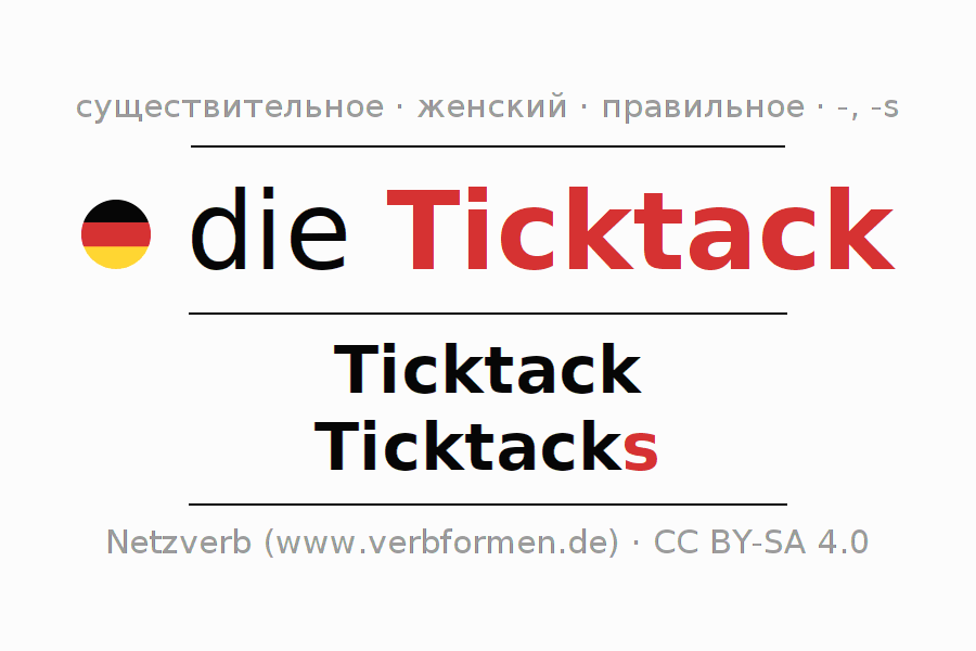 Склонение существительного Ticktack (тик-так) даётся в родительном падеже единственного числаTicktack и в именительном падеже множественного числа Ticktacks. Существительное Ticktack склоняется по сильному типу, получая окончания -/s. Грамматический род Ticktack женский с определённым артиклем "die" Здесь можно просклонять не только Ticktack, но и все немецкие существительные. Kомментарии ☆
