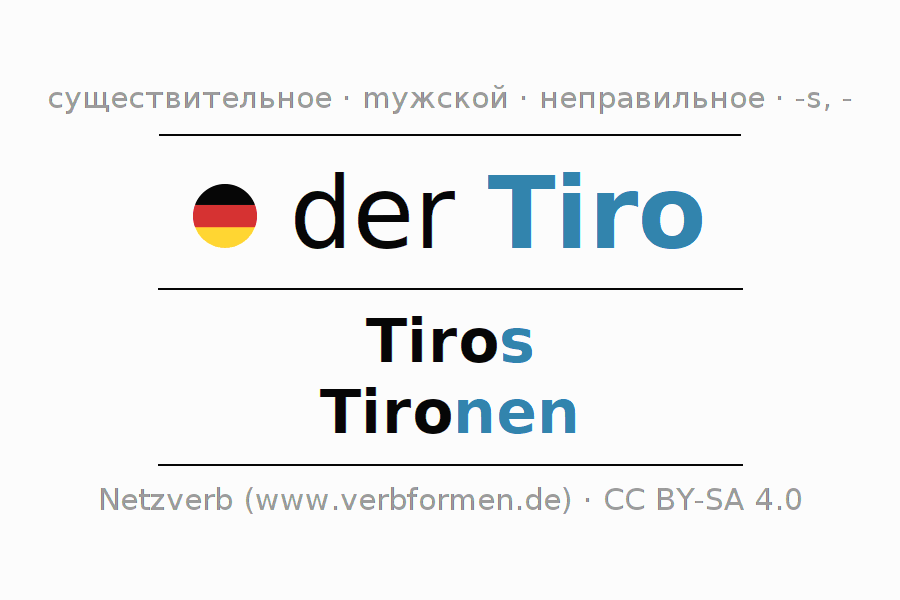 Склонение существительного Tiro даётся в родительном падеже единственного числаTiros и в именительном падеже множественного числа Tironen. Существительное Tiro при склонении получает окончания s/nen. Грамматический род Tiro мужской с определённым артиклем "der" Здесь можно просклонять не только Tiro, но и все немецкие существительные. Kомментарии ☆