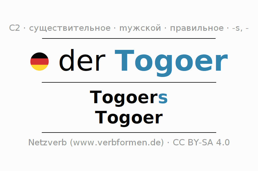 - Единственное число: der Togoer, des Togoers, dem Togoer, den Togoer