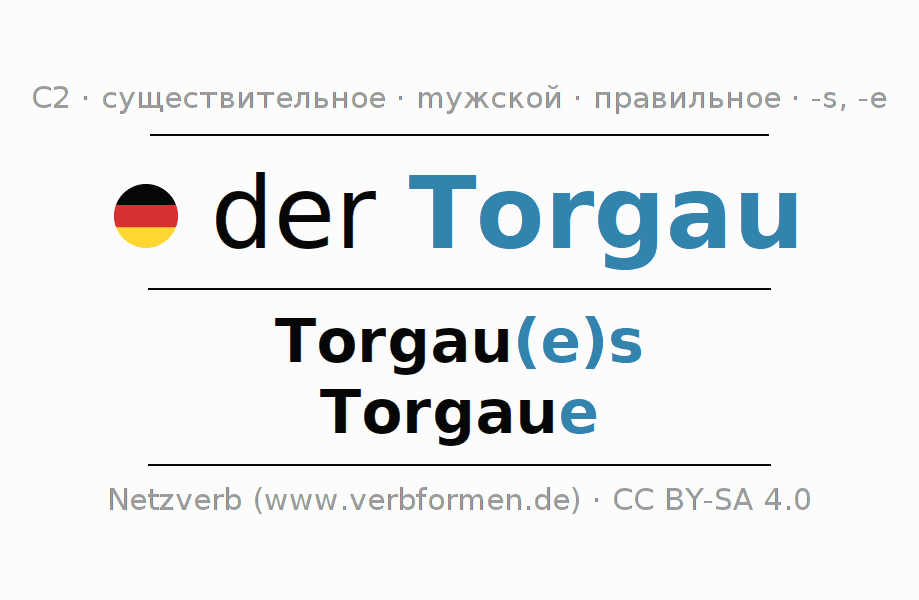 - Множественное число: die Torgaue, der Torgaue, den Torgauen, die Torgaue