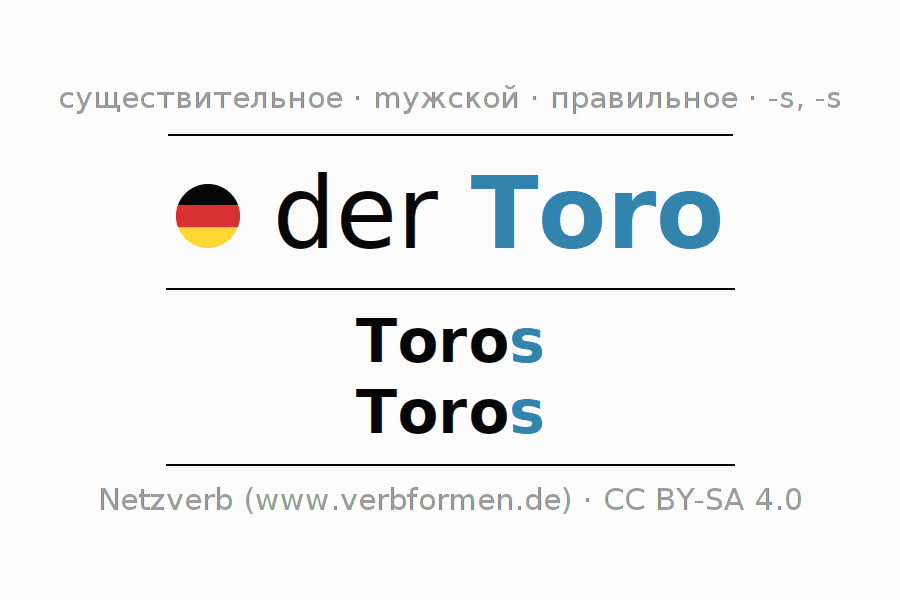 Склонение существительного Toro даётся в родительном падеже единственного числаToros и в именительном падеже множественного числа Toros. Существительное Toro склоняется по сильному типу, получая окончания s/s. Грамматический род Toro мужской с определённым артиклем "der" Здесь можно просклонять не только Toro, но и все немецкие существительные. Kомментарии ☆