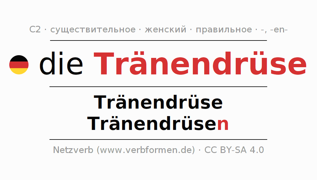 - Единственное число: die Tränendrüse, der Tränendrüse, der Tränendrüse, die Tränendrüse
