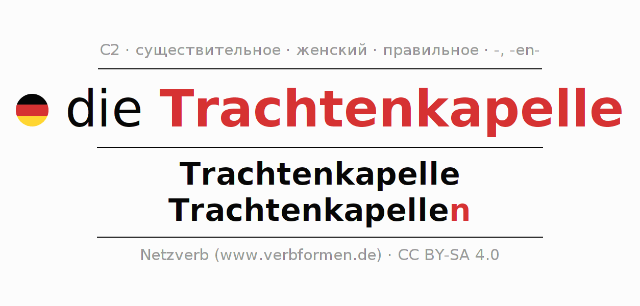 - Множественное число: die Trachtenkapellen, der Trachtenkapellen, den Trachtenkapellen, die Trachtenkapellen