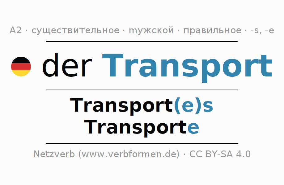 - Единственное число: der Transport, des Transport(e)s, dem Transport(e), den Transport