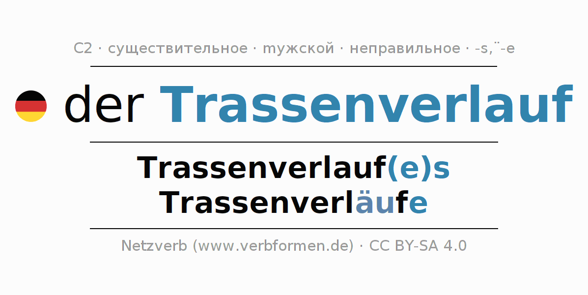 Склонение существительного Trassenverlauf (маршрут, траектория) даётся в родительном падеже единственного числаTrassenverlauf(e)s и в именительном падеже множественного числа Trassenverläufe. Существительное Trassenverlauf склоняется по сильному типу, получая окончания es/äu-e. Во множественном числе стоит умлаут. Грамматический род Trassenverlauf мужской с определённым артиклем "der" Здесь можно просклонять не только Trassenverlauf, но и все немецкие существительные. Существительное включён в словарный запас обладателя сертификата знания немецкого языка уровня C2. Kомментарии ☆