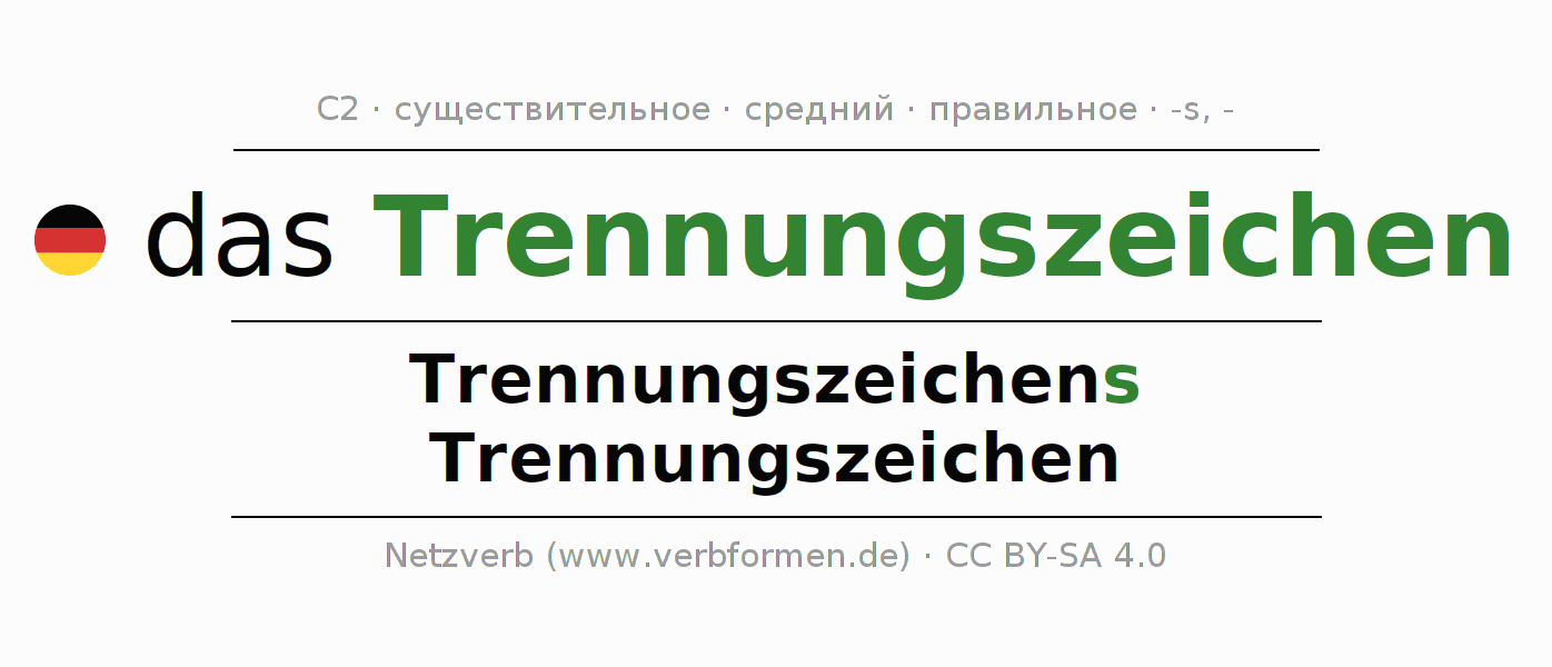 Склонение существительного Trennungszeichen (перено́с, перенос) даётся в родительном падеже единственного числаTrennungszeichens и в именительном падеже множественного числа Trennungszeichen. Существительное Trennungszeichen склоняется по сильному типу, получая окончания s/-. Грамматический род Trennungszeichen средний с определённым артиклем "das" Здесь можно просклонять не только Trennungszeichen, но и все немецкие существительные. Существительное включён в словарный запас обладателя сертификата знания немецкого языка уровня C2. Kомментарии ☆