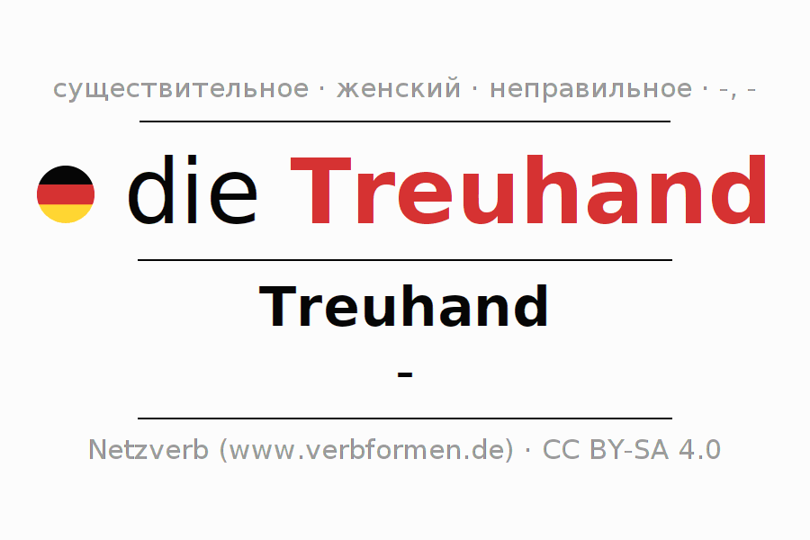 Склонение существительного Treuhand (опе́ка, доверительное управление) даётся в родительном падеже единственного числаTreuhand и в именительном падеже множественного числа -. Существительное Treuhand при склонении получает окончания -/-. Не образует форм множественного числа. Грамматический род Treuhand женский с определённым артиклем "die" Здесь можно просклонять не только Treuhand, но и все немецкие существительные. Kомментарии ☆