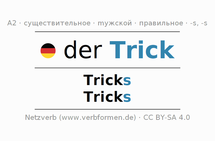- Множественное число: die Tricks, der Tricks, den Tricks, die Tricks