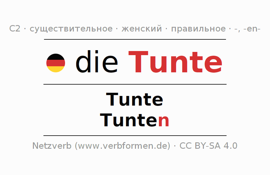 - Единственное число: die Tunte, der Tunte, der Tunte, die Tunte