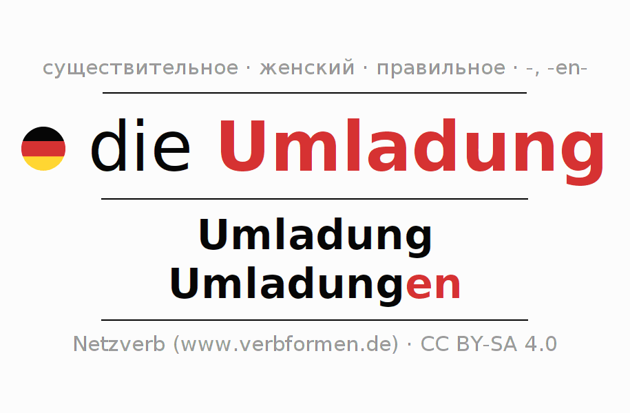 Склонение существительного Umladung (перегру́зка, перегрузка) даётся в родительном падеже единственного числаUmladung и в именительном падеже множественного числа Umladungen. Существительное Umladung склоняется по слабому типу, получая окончания -/en. Грамматический род Umladung женский с определённым артиклем "die" Здесь можно просклонять не только Umladung, но и все немецкие существительные. Kомментарии ☆