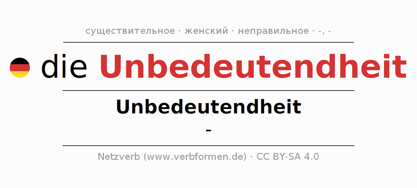 Склонение существительного Unbedeutendheit (малозначительность, незначительность) даётся в родительном падеже единственного числаUnbedeutendheit и в именительном падеже множественного числа -. Существительное Unbedeutendheit при склонении получает окончания -/-. Не образует форм множественного числа. Грамматический род Unbedeutendheit женский с определённым артиклем "die" Здесь можно просклонять не только Unbedeutendheit, но и все немецкие существительные. Kомментарии ☆