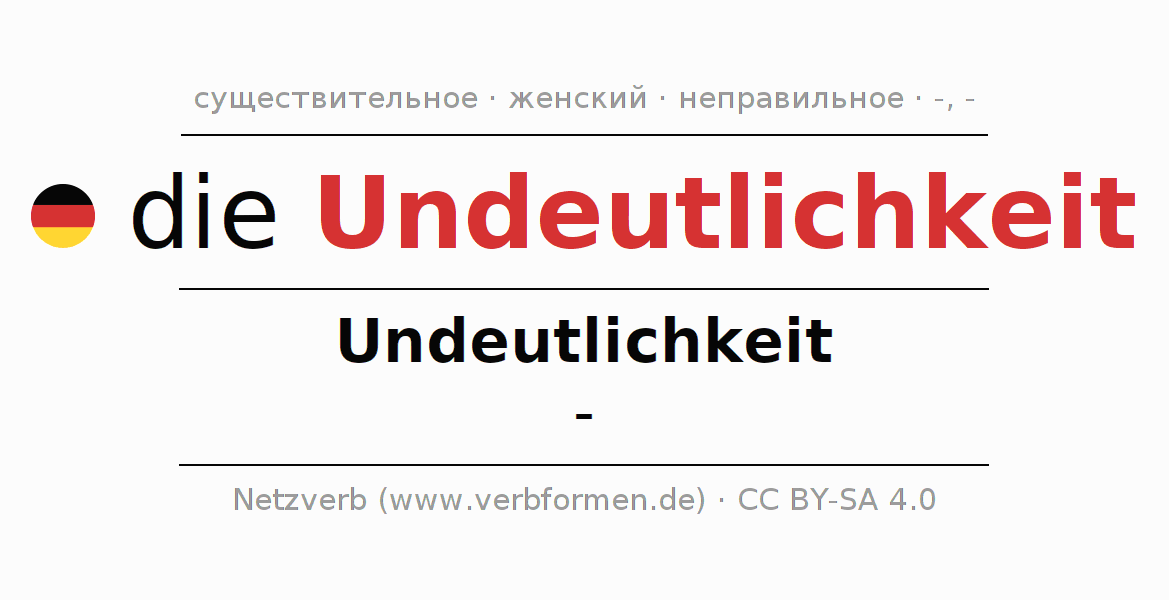Склонение существительного Undeutlichkeit (неопределенность, нея́сность) даётся в родительном падеже единственного числаUndeutlichkeit и в именительном падеже множественного числа -. Существительное Undeutlichkeit при склонении получает окончания -/-. Не образует форм множественного числа. Грамматический род Undeutlichkeit женский с определённым артиклем "die" Здесь можно просклонять не только Undeutlichkeit, но и все немецкие существительные. Kомментарии ☆
