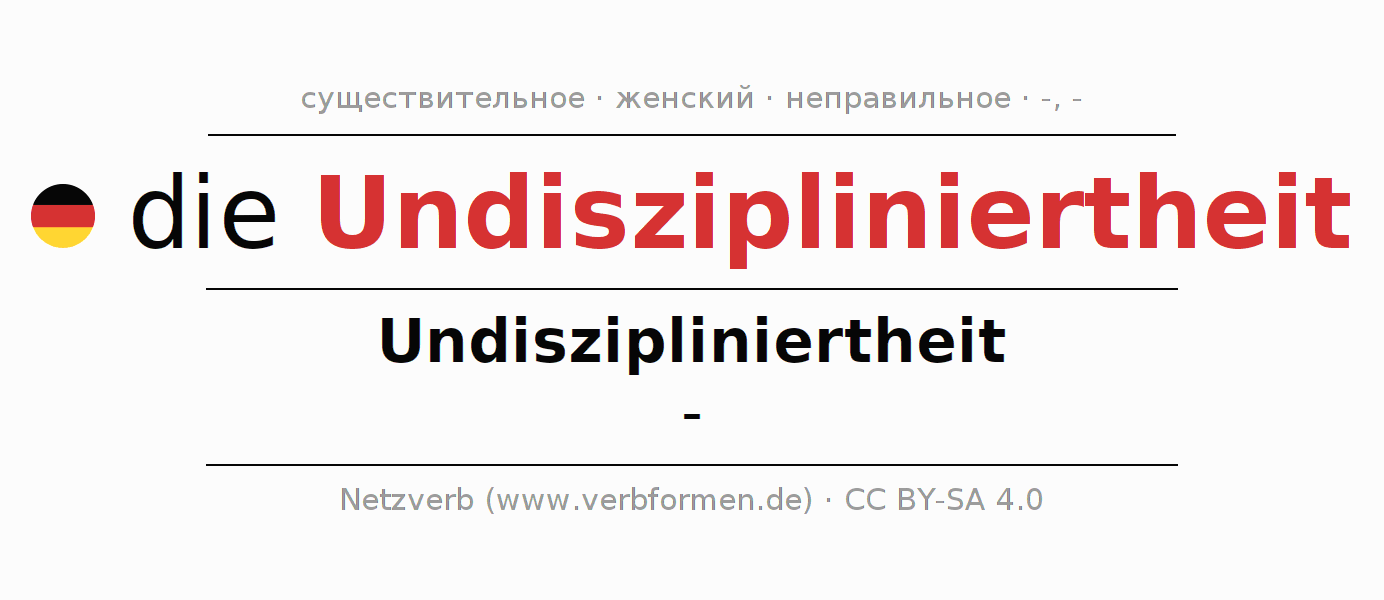 - Единственное число: die Undiszipliniertheit, der Undiszipliniertheit, der Undiszipliniertheit, die Undiszipliniertheit