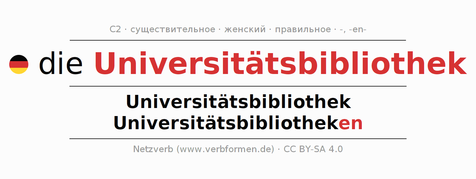 - Единственное число: die Universitätsbibliothek, der Universitätsbibliothek, der Universitätsbibliothek, die Universitätsbibliothek