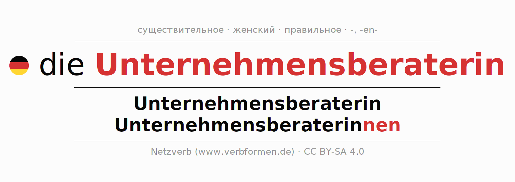 - Единственное число: die Unternehmensberaterin, der Unternehmensberaterin, der Unternehmensberaterin, die Unternehmensberaterin