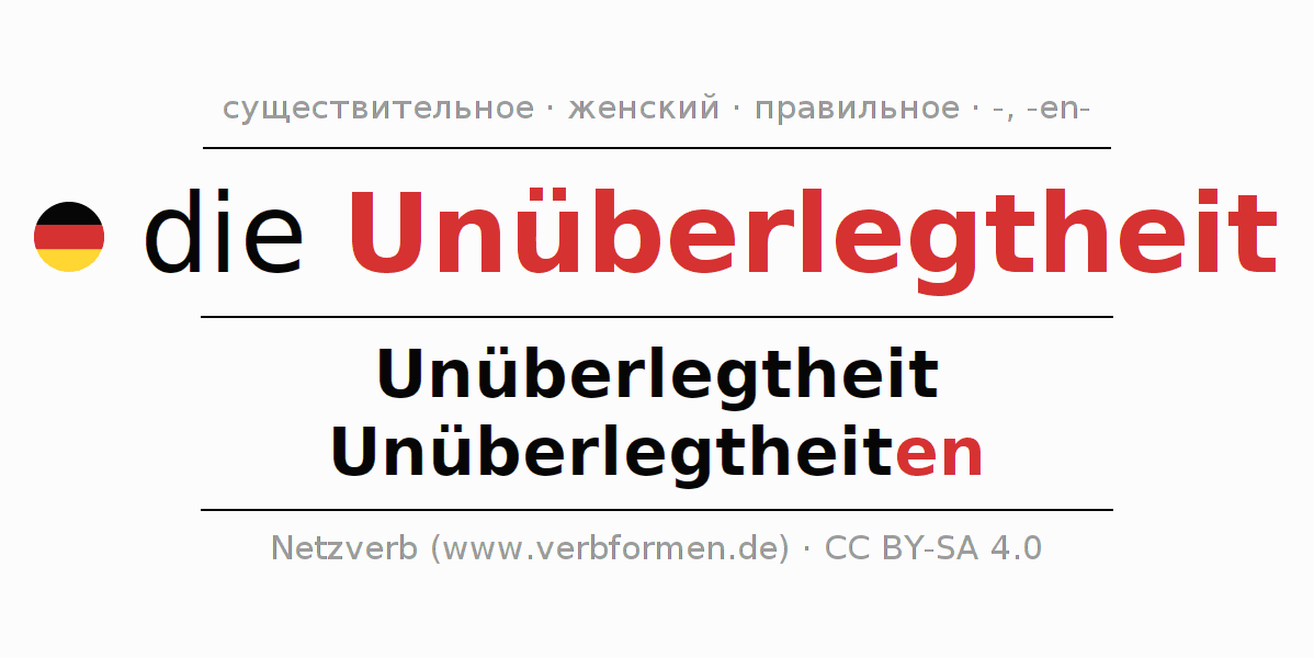 Склонение существительного Unüberlegtheit (беспе́чность, необду́манность) даётся в родительном падеже единственного числаUnüberlegtheit и в именительном падеже множественного числа Unüberlegtheiten. Существительное Unüberlegtheit склоняется по слабому типу, получая окончания -/en. Грамматический род Unüberlegtheit женский с определённым артиклем "die" Здесь можно просклонять не только Unüberlegtheit, но и все немецкие существительные. Kомментарии ☆