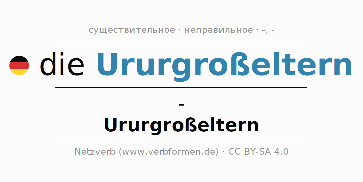Склонение существительного Ururgroßeltern (прапрадед и прапрабабушка, прародители) даётся в родительном падеже единственного числа- и в именительном падеже множественного числа Ururgroßeltern. Существительное Ururgroßeltern при склонении получает окончания /-. Не образует форм единственного числа. Однако существительное может употребляться в другом роде и с другим артиклем. Здесь можно просклонять не только Ururgroßeltern, но и все немецкие существительные. Kомментарии ☆