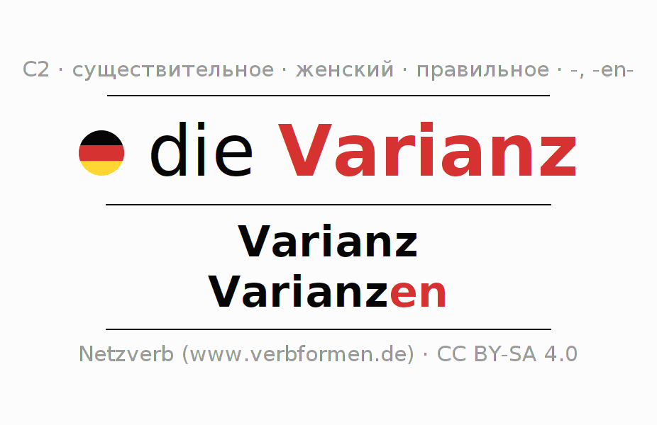 - Единственное число: die Varianz, der Varianz, der Varianz, die Varianz