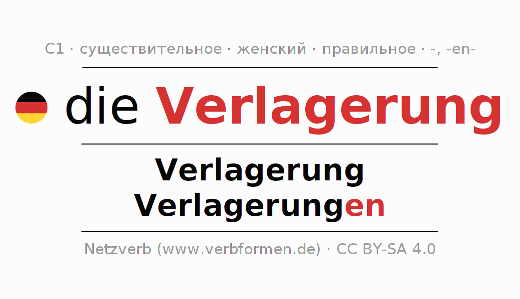 - Множественное число: die Verlagerungen, der Verlagerungen, den Verlagerungen, die Verlagerungen