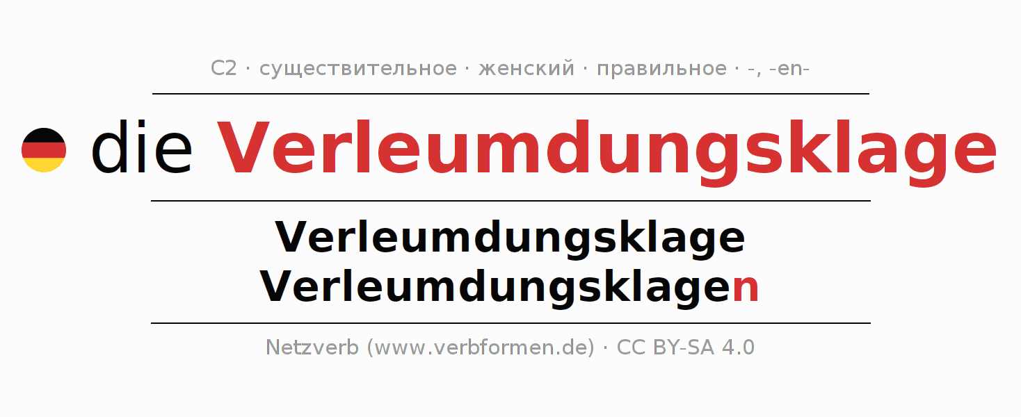 - Множественное число: die Verleumdungsklagen, der Verleumdungsklagen, den Verleumdungsklagen, die Verleumdungsklagen