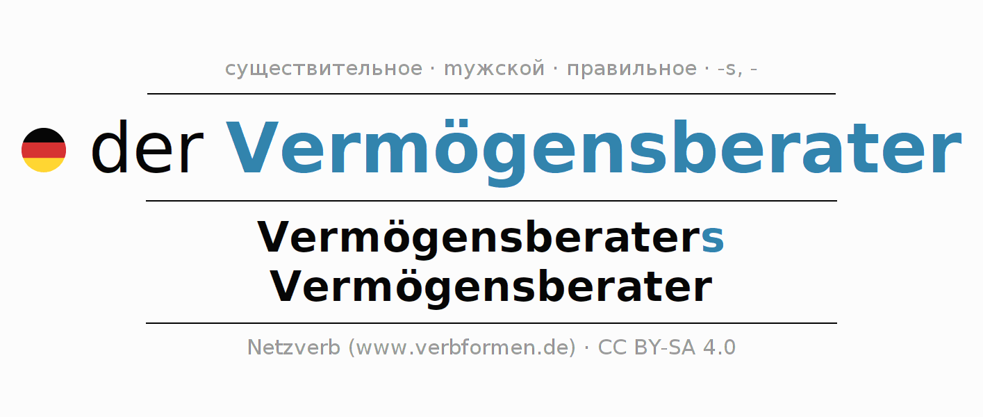 - Множественное число: die Vermögensberater, der Vermögensberater, den Vermögensberatern, die Vermögensberater