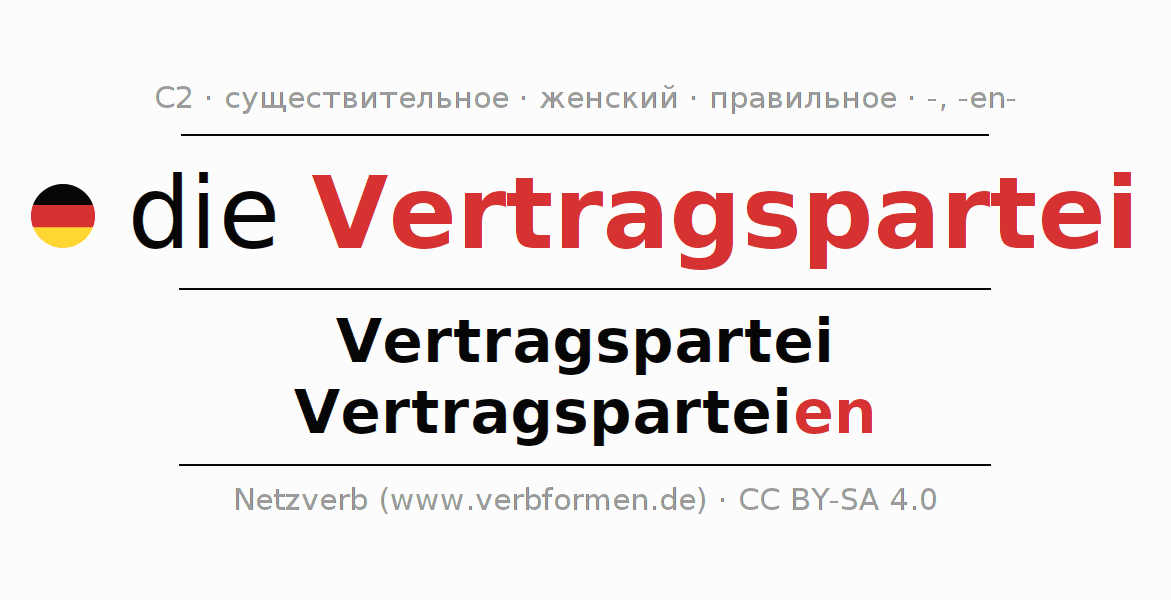 - Множественное число: die Vertragsparteien, der Vertragsparteien, den Vertragsparteien, die Vertragsparteien