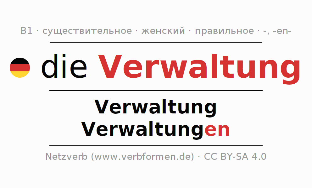 - Множественное число: die Verwaltungen, der Verwaltungen, den Verwaltungen, die Verwaltungen