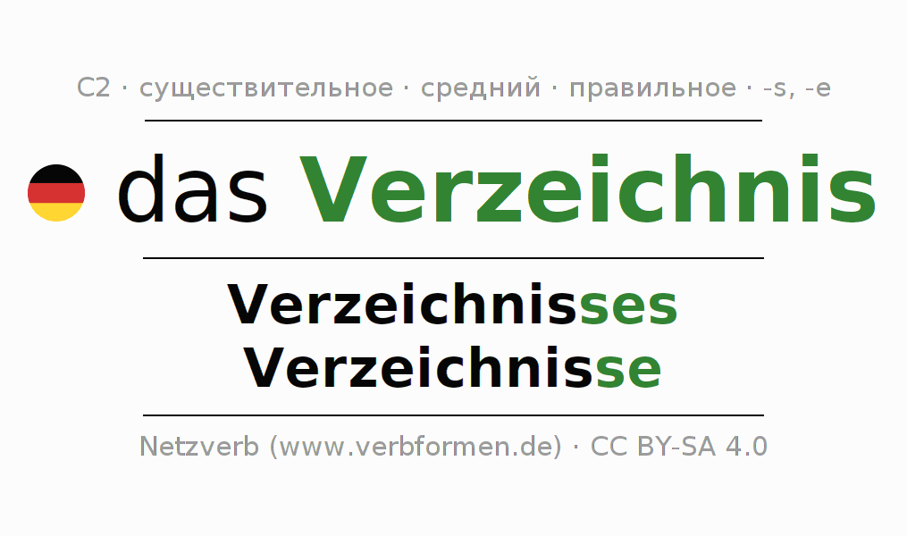 - Множественное число: die Verzeichnisse, der Verzeichnisse, den Verzeichnissen, die Verzeichnisse