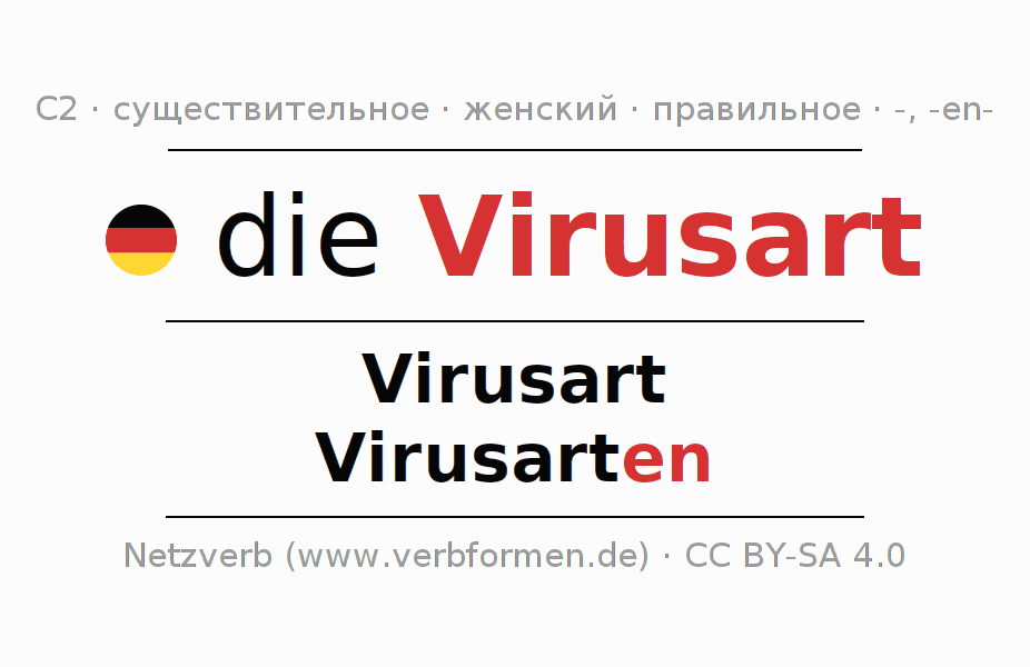 - Единственное число: die Virusart, der Virusart, der Virusart, die Virusart