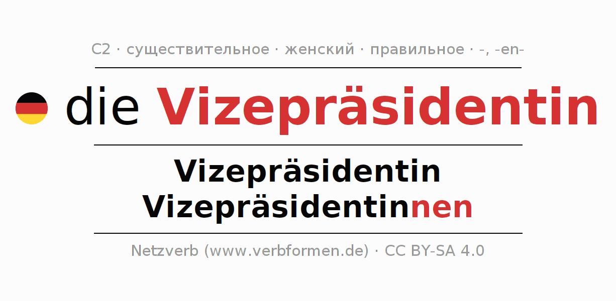 - Множественное число: die Vizepräsidentinnen, der Vizepräsidentinnen, den Vizepräsidentinnen, die Vizepräsidentinnen