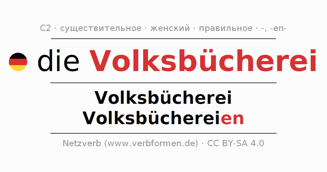 - Множественное число: die Volksbüchereien, der Volksbüchereien, den Volksbüchereien, die Volksbüchereien
