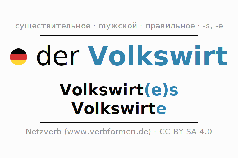 - Единственное число: der Volkswirt, des Volkswirt(e)s, dem Volkswirt(e), den Volkswirt