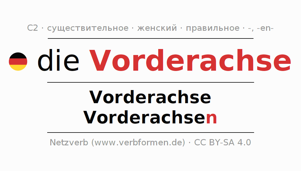 - Множественное число: die Vorderachsen, der Vorderachsen, den Vorderachsen, die Vorderachsen