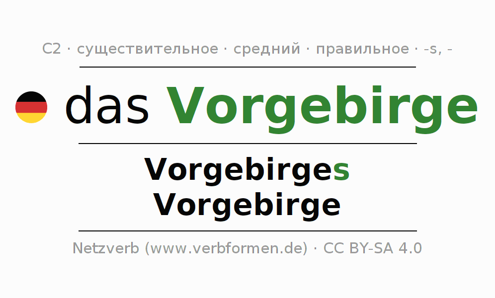 Склонение существительного Vorgebirge (мыс, предго́рье) даётся в родительном падеже единственного числаVorgebirges и в именительном падеже множественного числа Vorgebirge. Существительное Vorgebirge склоняется по сильному типу, получая окончания s/-. Грамматический род Vorgebirge средний с определённым артиклем "das" Здесь можно просклонять не только Vorgebirge, но и все немецкие существительные. Существительное включён в словарный запас обладателя сертификата знания немецкого языка уровня C2. Kомментарии ☆