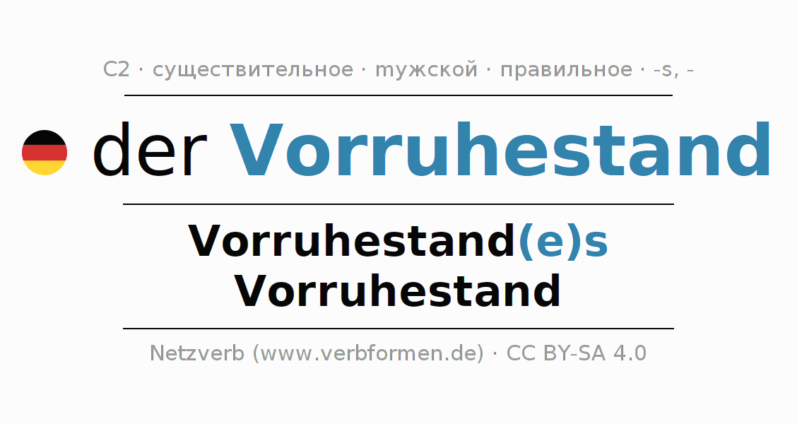 Склонение существительного Vorruhestand (досрочная пенсия, досрочный выход на пенсию) даётся в родительном падеже единственного числаVorruhestand(e)s и в именительном падеже множественного числа Vorruhestand. Существительное Vorruhestand склоняется по сильному типу, получая окончания es/-. Грамматический род Vorruhestand мужской с определённым артиклем "der" Здесь можно просклонять не только Vorruhestand, но и все немецкие существительные. Существительное включён в словарный запас обладателя сертификата знания немецкого языка уровня C2. Kомментарии ☆