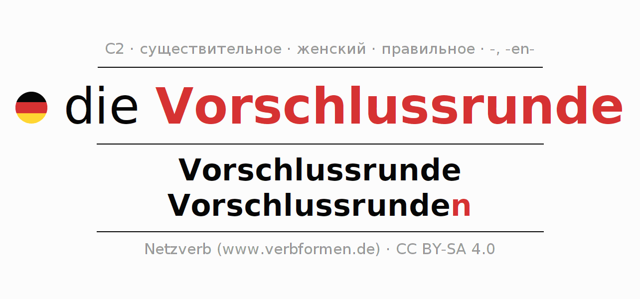 - Единственное число: die Vorschlussrunde, der Vorschlussrunde, der Vorschlussrunde, die Vorschlussrunde