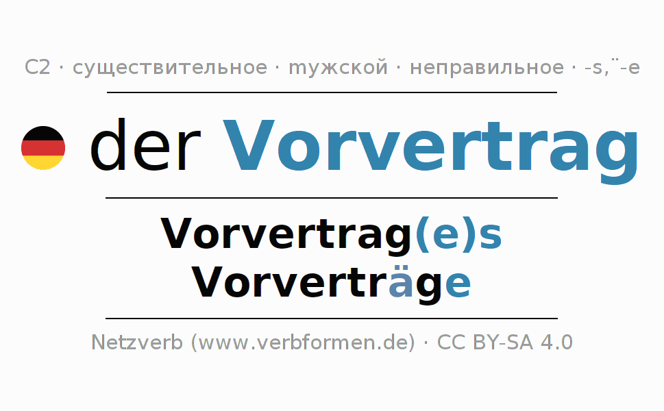- Множественное число: die Vorverträge, der Vorverträge, den Vorverträgen, die Vorverträge