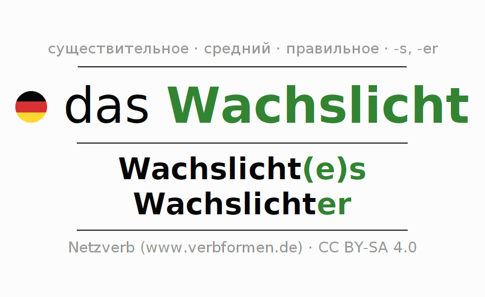 - Множественное число: die Wachslichter, der Wachslichter, den Wachslichtern, die Wachslichter