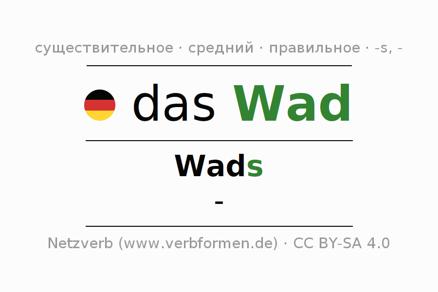 Склонение существительного Wad даётся в родительном падеже единственного числаWads и в именительном падеже множественного числа -. Существительное Wad склоняется по сильному типу, получая окончания s/-. Не образует форм множественного числа. Грамматический род Wad средний с определённым артиклем "das" Здесь можно просклонять не только Wad, но и все немецкие существительные. Kомментарии ☆