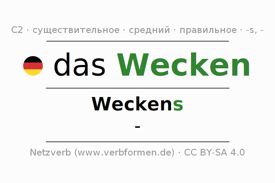 Склонение существительного Wecken (подъём, будильник) даётся в родительном падеже единственного числаWeckens и в именительном падеже множественного числа -. Существительное Wecken склоняется по сильному типу, получая окончания s/-. Не образует форм множественного числа. Грамматический род Wecken средний с определённым артиклем "das" Однако существительное может употребляться в другом роде и с другим артиклем. Здесь можно просклонять не только Wecken, но и все немецкие существительные. Существительное включён в словарный запас обладателя сертификата знания немецкого языка уровня C2. Kомментарии ☆