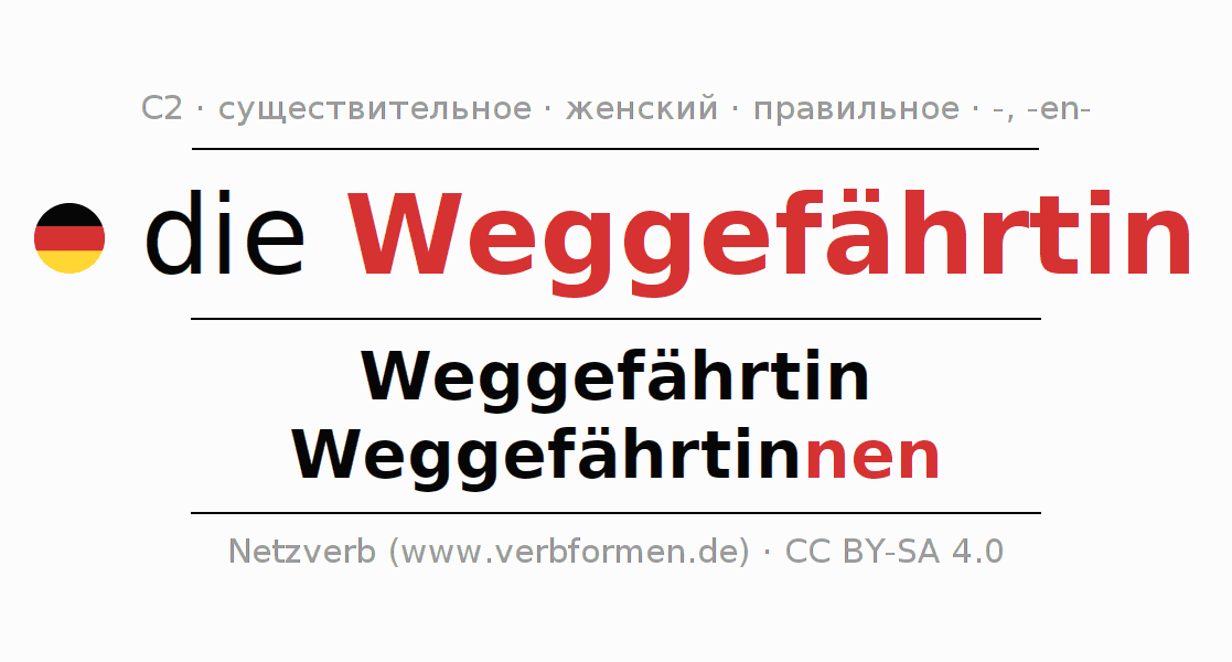 Склонение существительного Weggefährtin (сора́тница, спу́тница) даётся в родительном падеже единственного числаWeggefährtin и в именительном падеже множественного числа Weggefährtinnen. Существительное Weggefährtin склоняется по слабому типу, получая окончания -/nen. Грамматический род Weggefährtin женский с определённым артиклем "die" Здесь можно просклонять не только Weggefährtin, но и все немецкие существительные. Существительное включён в словарный запас обладателя сертификата знания немецкого языка уровня C2. Kомментарии ☆
