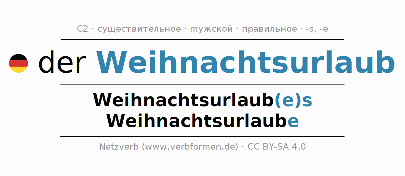 - Множественное число: die Weihnachtsurlaube, der Weihnachtsurlaube, den Weihnachtsurlauben, die Weihnachtsurlaube