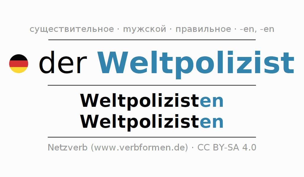 - Единственное число: der Weltpolizist, des Weltpolizisten, dem Weltpolizisten, den Weltpolizisten