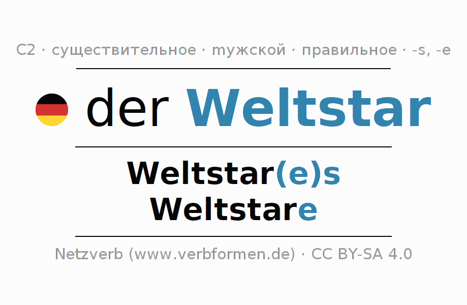 - Единственное число: der Weltstar, des Weltstar(e)s, dem Weltstar(e), den Weltstar