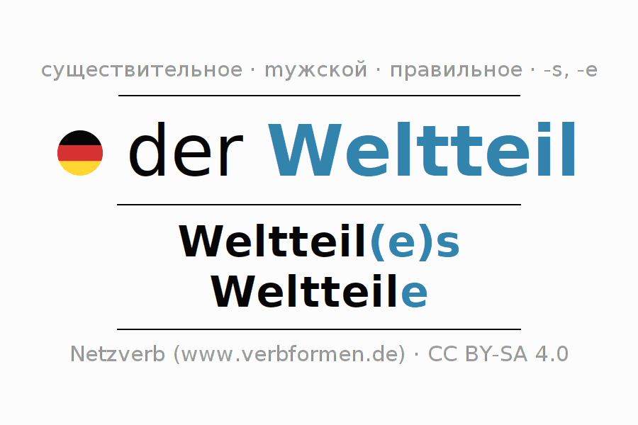 Склонение существительного Weltteil (географический район, континент) даётся в родительном падеже единственного числаWeltteil(e)s и в именительном падеже множественного числа Weltteile. Существительное Weltteil склоняется по сильному типу, получая окончания es/e. Грамматический род Weltteil мужской с определённым артиклем "der" Здесь можно просклонять не только Weltteil, но и все немецкие существительные. Kомментарии ☆