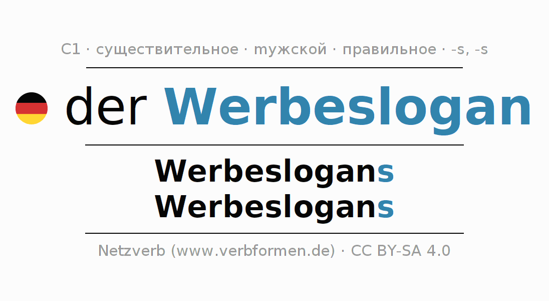 - Единственное число: der Werbeslogan, des Werbeslogans, dem Werbeslogan, den Werbeslogan